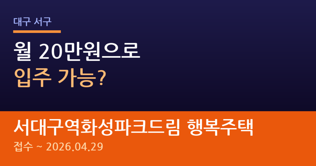 대구 서구 서대구역화성파크드림 행복주택 입주자 모집이 시작됐어요. 임대보증금 4천만원대, 월임대료 20만원대로 합리적인 주거비가 가장 큰 매력이에요. 대학생부터 고령자까지 다양한 계층이